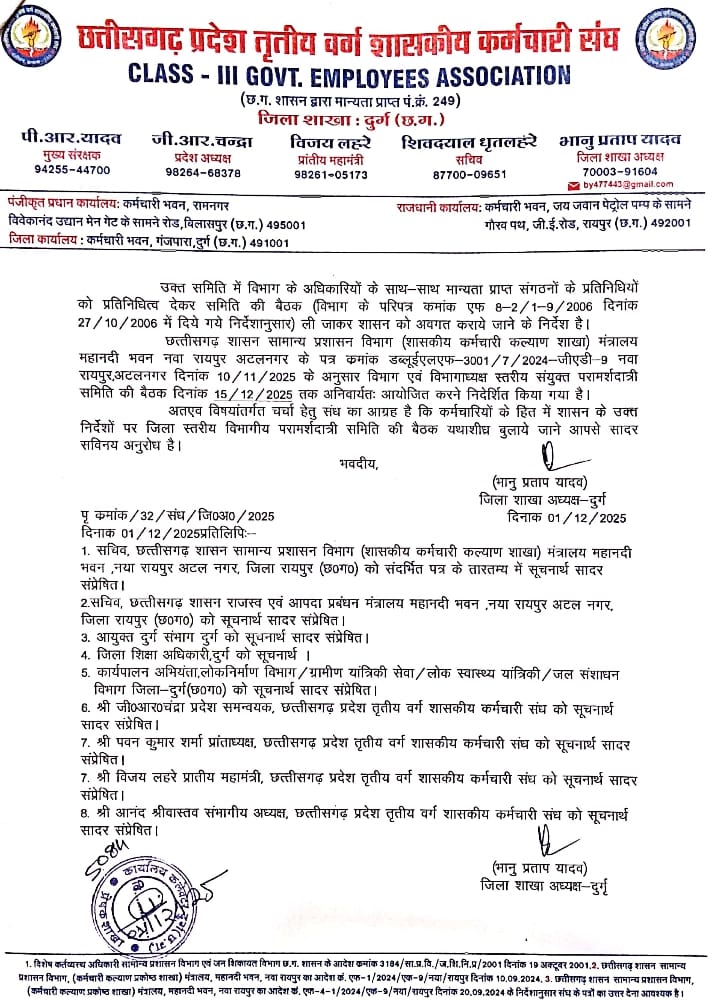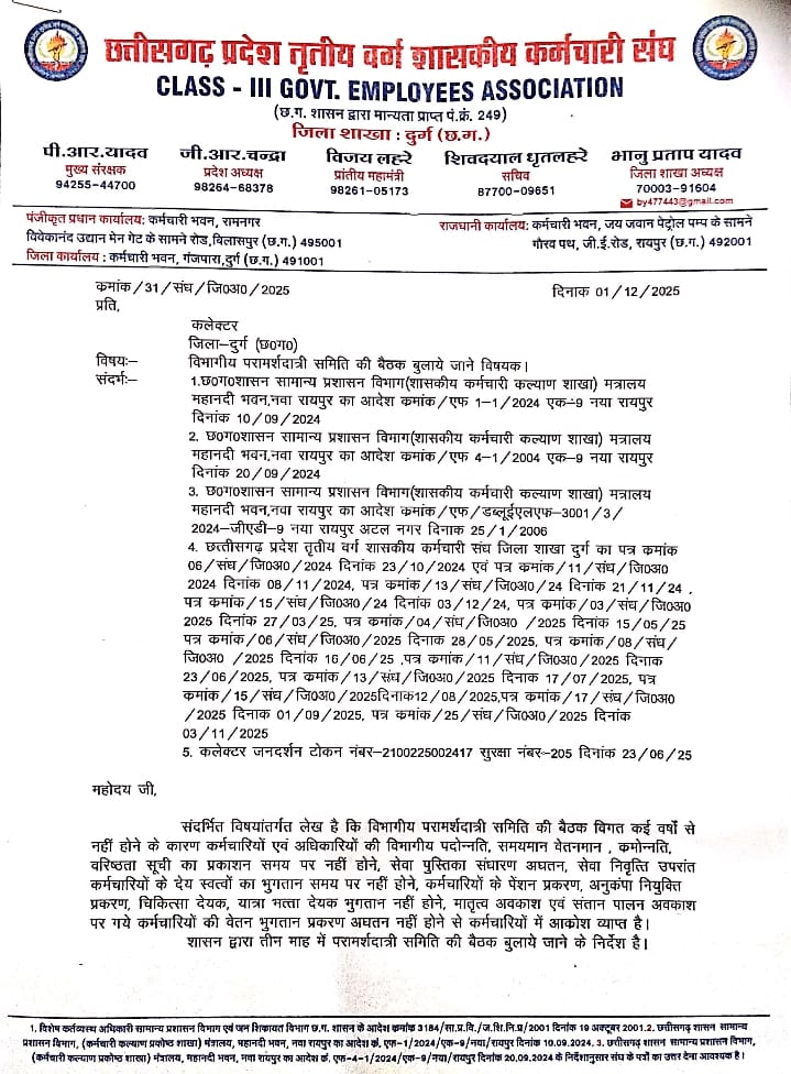 * पांच वर्ष पूर्व दिनांक 05/02/2020 को जिला स्तरीय संयुक्त परामर्शदात्री समिति की बैठक होने के बाद आज दिनांक तक समिति की बैठक नहीं हुई है। शासन द्वारा तीन माह में परामर्शदात्री समिति की बैठक बुलाये जाने के निर्देश है। उक्त समिति में विभाग के अधिकारियों के साथ-साथ मान्यता प्राप्त संगठनों के प्रतिनिधियों को प्रतिनिधित्व देकर समिति की बैठक (विभाग के परिपत्र कमांक एफ 8-2/1-9/2006 दिनांक 27/10/2006 में दिये गये निर्देशानुसार) ली जाकर शासन को अवगत कराये जाने के निर्देश है।* *छतीसगढ़ शासन सामान्य प्रशासन विभाग (शासकीय कर्मचारी कल्याण शाखा) मंत्रालय महानदी भवन ,नवा रायपुर अटलनगर के पत्र क्रमांक डब्लूईएलएफ-3001/7/20234-जीएडी-9 नवा रायपुर,अटलनगर दिनांक 10/11/2025 के अनुसार विभाग एवं विभागाध्यक्ष स्तरीय संयुक्त परामर्शदात्री समिति की बैठक दिनांक 15/12/2025 तक अनिवार्यतः करने निर्देर्शित किया गया है।* * जिला स्तरीय परामर्शदात्री समिति की बैठक विगत कई वर्षों से नहीं होने के कारण कर्मचारियों एवं अधिकारियों की विभागीय पदोन्नति, समयमान वेतनमान , क्रमोन्नति, वरिष्ठता सूची का प्रकाशन समय पर नहीं होने, सेवा पुस्तिका संधारण अघतन, सेवा निवृत्ति उपरांत कर्मचारियों के देय स्वत्वों का भुगतान समय पर नहीं होने, कर्मचारियों के पेंशन प्रकरण, अनुकंपा नियुक्ति प्रकरण, चिकित्सा देयक, यात्रा भत्ता देयक भुगतान नहीं होने, मातृत्व अवकाश एवं संतान पालन अवकाश पर गये कर्मचारियों की वेतन भुगतान प्रकरण अघतन नहीं होने से कर्मचारियों में आक्रोश व्याप्त है।* * शासन के उक्त निर्देशानुसार विभागीय परामर्शदात्री समिति की बैठक आयोजित करने छत्तीसगढ़ प्रदेश तृतीय वर्ग शासकीय कर्मचारी के जिलाध्यक्ष एवं छ0ग0कर्मचारी अधिकारी फेडरेशन-दुर्ग के मीडिया प्रभारी भानु प्रताप यादव ने ज्ञापन कलेक्टर महोदय दुर्ग को प्रेषित किया है।* भवदीय, (भानु प्रताप यादव) जिला शाखा अध्यक्ष-दुर्ग