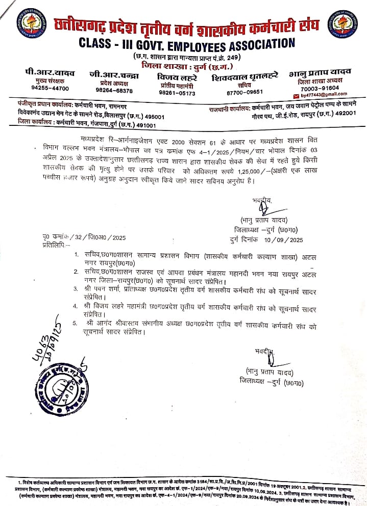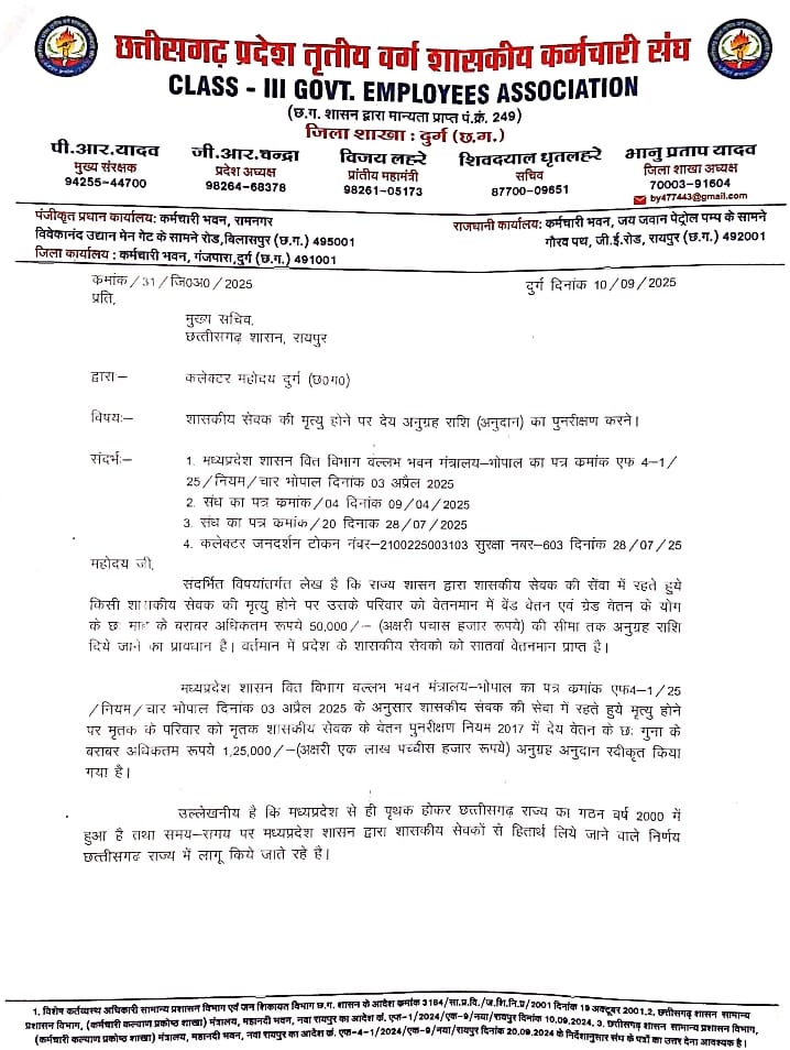 शासकीय सेवक की मृत्यु होने पर देय अनुग्रह राशि (अनुदान) का पुनरीक्षण करने छ0ग0प्रदेश तृतीय वर्ग शा0कर्मचारी संध की मांग- जिलाध्यक्ष भानु प्रताप यादव// छत्तीसगढ़ प्रदेश तृतीय वर्ग शासकीय कर्मचारी संध जिलाध्यक्ष दुर्ग भानु प्रताप यादव द्वारा माननीय मुख्य सचिव, छत्तीसगढ़ शासन रायपुर के नाम कलेक्टर महोदय दुर्ग को ज्ञापन पेश किया है कि किसी शासकीय सेवक की मृत्यु होने पर उसके परिवार को वेतनमान में बेंड वेतन एवं ग्रेड वेतन के योग के छः माह के बराबर अधिकतम रूपये 50,000/- (अक्षरी पचास हजार रूपये) की सीमा तक अनुग्रह राशि दिये जाने का प्रावधान है। वर्तमान में प्रदेश के शासकीय सेवकों को सातवां वेतनमान प्राप्त है। मध्यप्रदेश शासन वित विभाग वल्लभ भवन मंत्रालय-भोपाल का पत्र क्रमांक एफ4-1/25 /नियम/चार भोपाल दिनांक 03 अप्रैल 2025 के अनुसार शासकीय सेवक की सेवा में रहते हुये मृत्यु होने पर मृतक के परिवार को मृतक शासकीय सेवक के वेतन पुनरीक्षण नियम 2017 में देय वेतन के छः गुना के बराबर अधिकतम रूपये 1,25,000/-(अक्षरी एक लाख पच्चीस हजार रूपये) अनुग्रह अनुदान स्वीकृत किया गया है। उल्लेखनीय है कि मध्यप्रदेश से ही पृथक होकर छत्तीसगढ़ राज्य का गठन वर्ष 2000 में हुआ है तथा समय-समय पर मध्यप्रदेश शासन द्वारा शासकीय सेवकों से हितार्थ लिये जाने वाले निर्णय छत्तीसगढ़ राज्य में लागू किये जाते रहे है। मध्यप्रदेश रि-आर्गनाइजेशन एक्ट सेक्शन 61 के आधार पर मध्यप्रदेश शासन वित्त विभाग वल्लभ भवन मंत्रालय-भोपाल का पत्र क्रमांक एफ 4-1/25 /नियम/चार भोपाल दिनांक 03 अप्रैल 2025 के उक्तादेशानुसार छत्तीसगढ़ राज्य शासन द्वारा शासकीय सेवक की सेवा में रहते हंुये किसी शासकीय सेवक की मृत्यु होने पर उसके परिवार को अधिकतम रूपये 1,25,000/-(अक्षरी एक लाख पच्चीस हजार रूपये) अनुग्रह अनुदान स्वीकृत किये जाने अनुरोध किया है। (भानु प्रताप यादव) जिलाध्यक्ष -दुर्ग (छ0ग0) जिलाध्यक्ष -दुर्ग (छ0ग0)