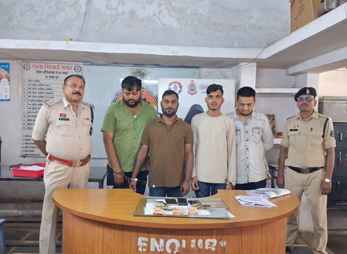 थाना भिलाई नगर, जिला दुर्ग दिनांक 23-09-2025 एशिया कप भारत-पाकिस्तान क्रिकेट मैच में आनलाईन सट्टेबाजी करने वाले गिरोह का पर्दाफाश। आनलाईन सट्टेबाजी गिरोह के 04 सदस्य गिरफ्तार। आरोपियों के कब्जे से नगदी 32,500/- रूपये, मोबाईल में लाखों रूपये के सट्टेबाजी का हिसाब किताब सहित 04 नग मोबाईल जुमला कीमती लगभग 2,50,000/-रूपये जप्त। आनलाईन सट्टेबाजी में आरोपीगण द्वारा uncle.Betg एप्लिकेशन का किया जा रहा था उपयोग। आरोपीगण द्वारा लाईन गुरू नामक एप का उपयोग कर सट्टा बाजार का भाव किया जाता था चेक।–00– दुर्ग पुलिस द्वारा जिले में सट्टा जुआ एवं अन्य अवैध धंधों मे संलिप्त आरोपीगण के विरूद्ध लगातार चलाए जा रहे अभियान के क्रम में भिलाईनगर थाना क्षेत्र में आनलाईन सट्टेबाजी में लिप्त गिरोह का भंडाफोड़ किया जाकर सट्टेबाजी में लिप्त 04 आरोपियों को गिरफ्तार करने में सफलता प्राप्त हुई है। वरिष्ठ अधिकारीगण के मार्गदर्शन में चलाए जा रहे अभियान के तहत दिनांक 22.09.2025 को मुखबीर से प्राप्त सूचना के आधार पर एसीसीयू एवं थाना भिलाई नगर की संयुक्त टीम को सूचना प्राप्त हुई कि जयंती स्टेडियम सिविक सेंटर में 04 व्यक्ति बैठकर आनलाईन सट्टेबाजी करते हुए भारत-पाकिस्तान क्रिकेट मैच में सट्टा लगाकर पैसे का हिसाब कर रहे हैं, सूचना पर पुलिस टीम द्वारा घेराबंदी कर मौके से आनलाईन सट्टेबाजी करते हुए 04 आरोपीगण को पकड़ा गया, जिन्होनें पूछताछ पर अपना नाम 01.अनिल सिंह साही उर्फ झमरू पिता स्व. हरजीत सिंह उम्र 32 वर्ष साकिन रूआंबांधा बस्ती जयस्तंभ चैक गुप्ता होटल के पास भिलाई 02. मयंक गावड़े पिता बाबूराव गावड़े उम्र 32 वर्ष साकिन सेक्टर 05, सड़क 26, क्वाटर 05ए भिलाई 03. सत्यम साहू पिता ए.के. साहू उम्र 24 वर्ष साकिन मकान नंबर 49एफ, रिसाली सेक्टर थाना नेवई एवं 04. निखिल साहू पिता कुशल साहू उम्र 22 वर्ष साकिन रूआंबांधा यादव चैक संदीप किराना स्टोर के पीछे भिलाई नगर बताया। आरोपीगण से पूछताछ पर उन्होंने बताया कि उनके द्वारा आनलाईन सट्टा एप्लीकेशन uncle.Betg के माध्यम से सट्टेबाजी किया जा रहा था एवं क्रिकेट सट्टा का भाव देखने के लिए क्रिकेट लाईन गुरू नामक एप्लीकेशन का उपयोग किया जा रहा था। यह आनलाईन सट्टा एपलीकेशन प्लेटफार्म उन्हें दुर्ग निवासी हर्ष देवांगन, रवि सोनकर एवं भुनेश्वर चंद्राकर नामक सट्टेबाजों से क्रय किया गया है। जिसे आरोपीगण द्वारा अपने मोबाइल मे इंस्टाॅल कर उसके द्वारा सट्टेबाजी किया जा रहा था। आरोपीगण से नगदी रकम 32,500/- रूपये एवं आनलाईन सट्टेबाजी में प्रयुक्त 04 नग मोबाईल जुमला कीमती लगभग 2,50,000/-रूपये तथा मोबाईल से लाखों रूपये के सट्टेबाजी संबंधी हिसाब किताब प्राप्त हुए हैं। आरोपीगण के विरूद्ध थाना भिलाई नगर के अपराध क्रमांक 495/2025 धारा छ.ग. जुआ प्रतिषेध अधीनिय