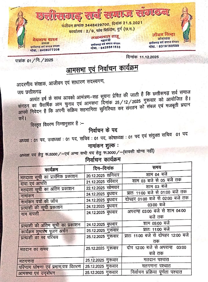 छत्तीसगढ़ सर्व समाज संगठन के त्रैवार्षिक आम चुनाव-2025 के आम चुनाव की धोषणा के साथ मतदाता सूची का प्रकाशन आज दिनांक 20/12/2025 को मुख्य चुनाव अधिकारी प्रमचंद देवांगन मोबाईल नंबर- 9893079224 की उपस्थिति में निर्वाचन कार्यक्रम स्थलः- सामुदायिक भवन (बड़ा शिव मंदिर ) पांच बिल्डिंग दुर्ग (छ0ग0) में किया गया।