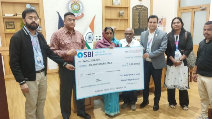 वरिष्ठ पुलिस अधीक्षक, दुर्ग, एसबीआई के क्षेत्रीय प्रबंधक श्री रूपक मंडल, सेक्टर-01 भिलाई तथा एसबीआई शाखा आदर्श नगर, जिला दुर्ग के शाखा प्रबंधक श्रीमती विनिता कोसरिया के द्वारा स्वर्गीय आरक्षक क.776 विक्रम सिंह, जिला पुलिस बल दुर्ग के नामिनी माताजी श्रीमती सरोज ठाकुर को 1 करोड़ रूपये का चेक सौंपा गया।