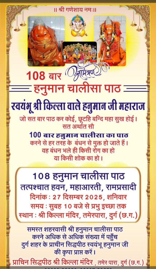 अति प्राचीन सिद्ध पीठ श्री किल्ला मंदिर में विराजे स्वयंभू हनुमान जी के दरबार में आज दिनांक 27/12/2025 दिन शनिवार को 108 बार हनुमान चालीसा पाठ का पठन किया गया , हनुमान चालीसा पठन होने के पश्चात श्री किल्ला मंदिर में हवन पूर्णाहुति हुआ।