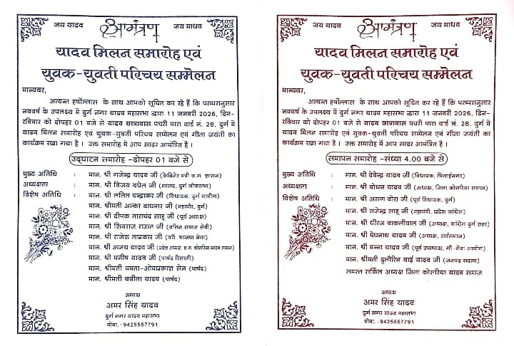 दुर्ग नगर यादव महासभा द्वारा 11 जनवरी-2026 दिन रविवार को दोपहर 01 बजे से यादव छात्रावास पचरीपारा वार्ड नंबर-28 दुर्ग में यादव मिलन समारोह एवं युवक